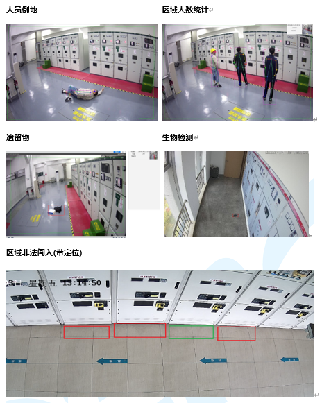 l 支持危险区域非法闯入、警戒线、人员倒地、固定区域人数统计、带点间隔人员入侵定位功能;