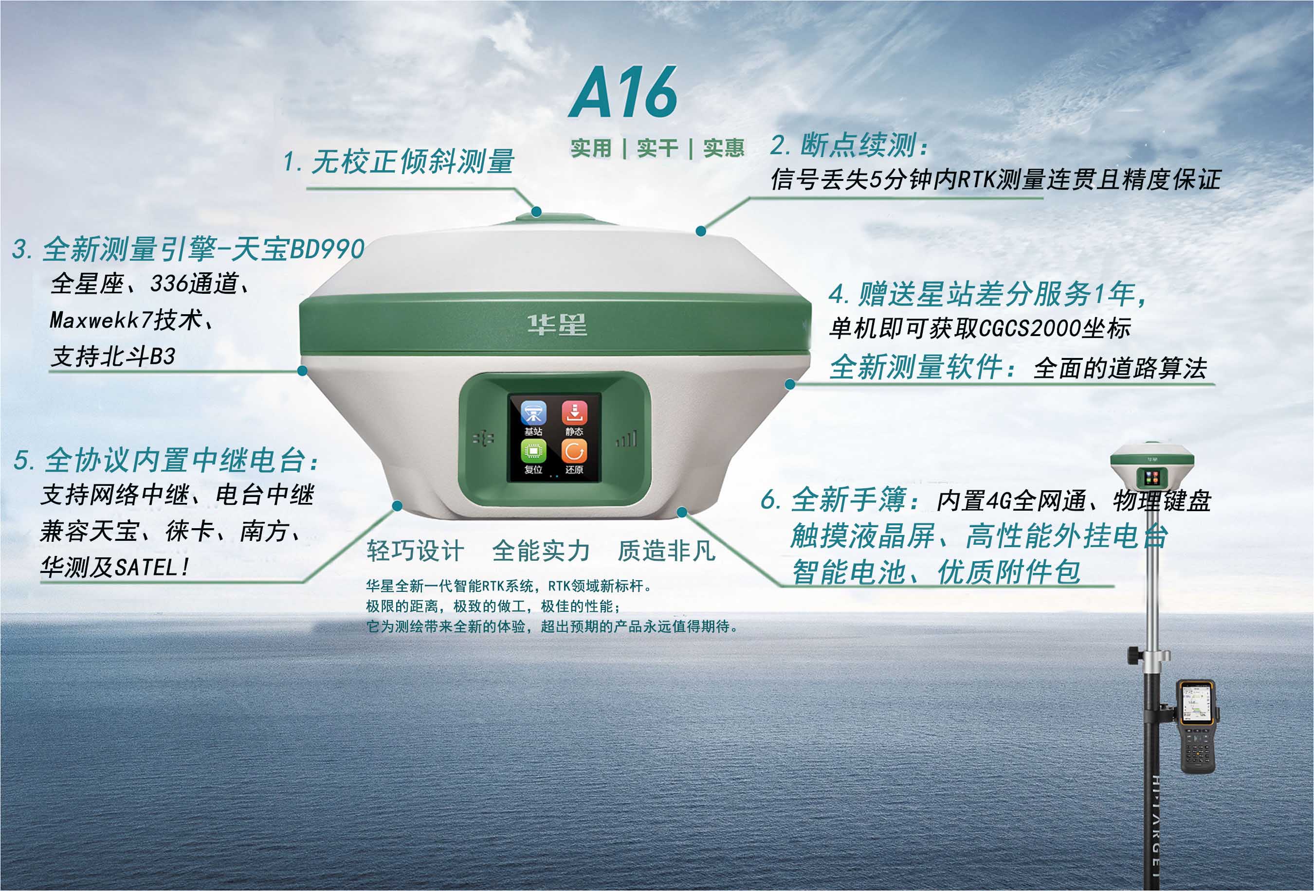 A16是华星品牌新一款高端GNSS接收机,新一代测量引擎,支持星站差分,内置4G全网通通讯和多协议电台,采用全新外观设计,镁合金结构,Linux3.2.0操作系统,内置高清OLED显示和电容式触摸屏,是一款极致、智能、轻巧的测量型GNSS接收机。